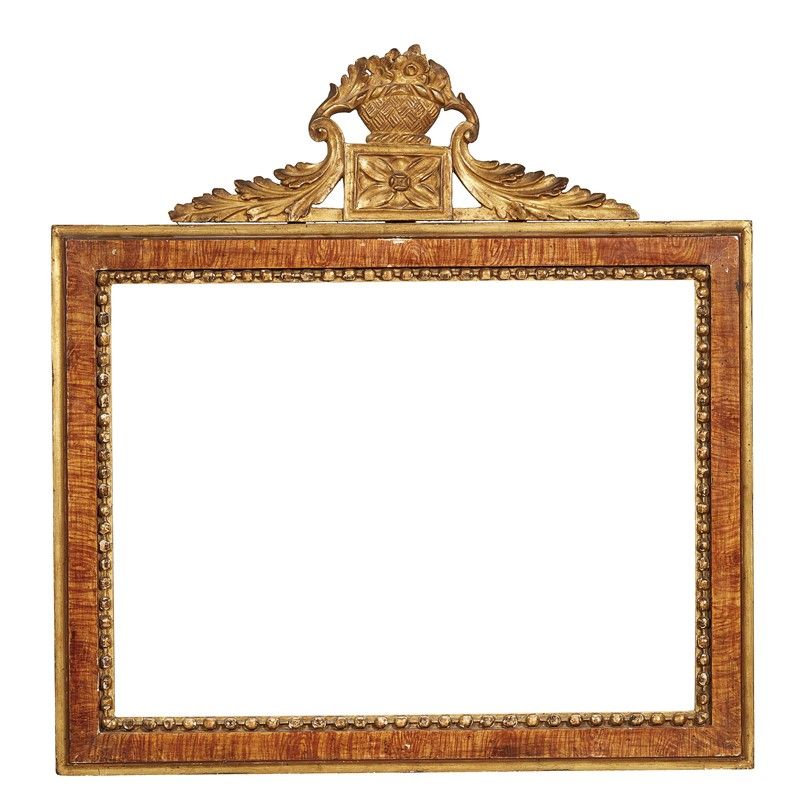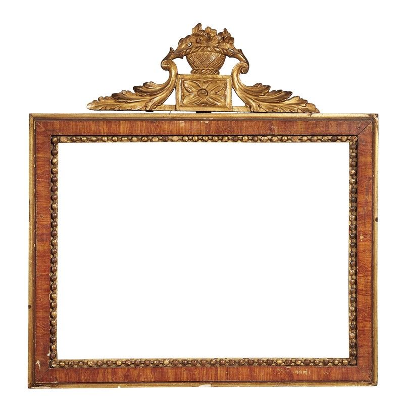 COPPIA DI CORNICI, LOMBARDIA, INIZIO SECOLO XIX in legno intagliato e dorato, battuta a perline si affianca a fascia liscia e scende a muro in più modanature, sormontata da cimasa lavorata a giorno con vaso di fiori; ingombro cm 74x71, luce 43,5x59. Montate a specchio