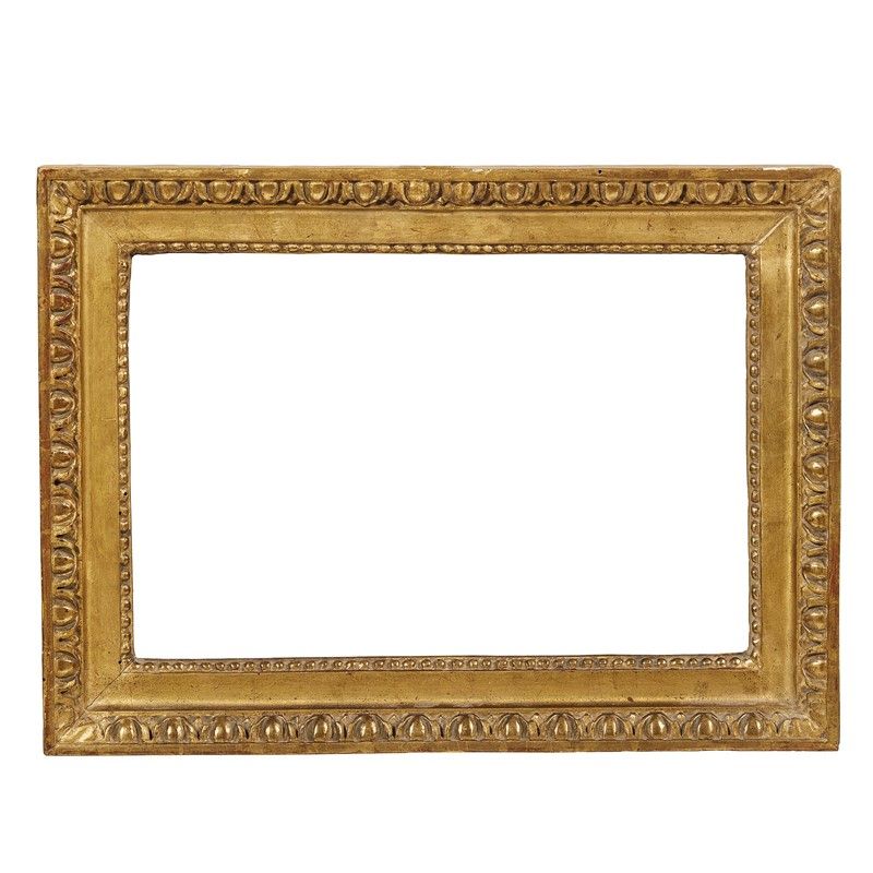 in legno intagliato e dorato, battuta a perline che si porta su fascia e sale su baccellatura; ingombro cm 29,5x40,5, luce cm 20,5x31,5