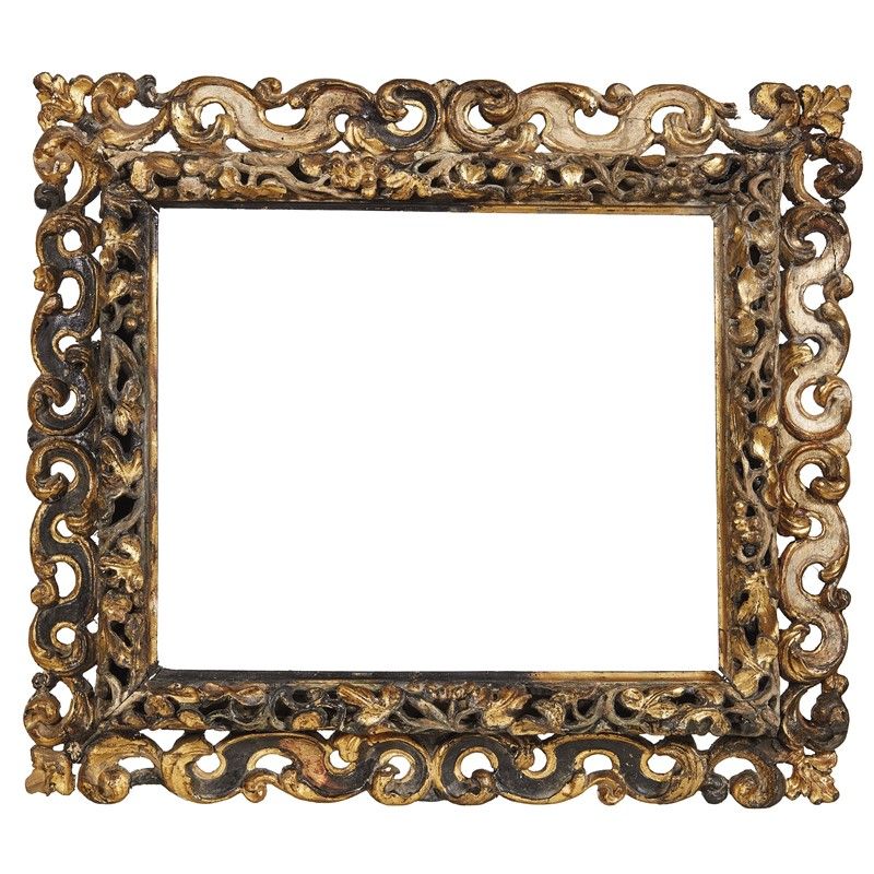 in legno intagliato, dipinto e dorato, battuta si porta su fascia profilata con ricco intaglio a tralci di vite e a grappoli d’uva, che scende su intaglio a giorno a girali; ingombro cm 59x67, luce cm 37x45,3