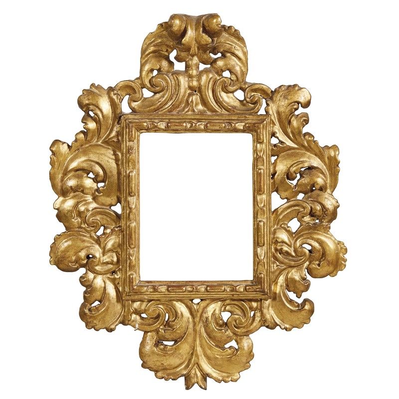 COPPIA DI PICCOLE CORNICI, ITALIA CENTRALE, SECOLO XVII in legno intagliato e dorato, fascia a fusarole è contornata da ricco intaglio a giorno a volute fogliacee e sormontato da foglia arricciata sulla cimasa; ingombro cm 55x43,5, luce cm 21,3x16,6. Montate a specchio