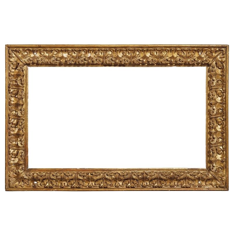 in legno intagliato e dorato, battuta si porta su fascia digradante con grandi foglie aggettanti aperte verso l’esterno; ingombro cm 175x116, luce cm 141x80,5