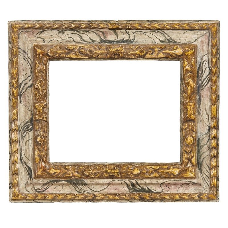 CORNICE, CENTRALE, SECOLO XVII in legno intagliato e dorato e laccato, battuta a foglie lanceolate fermate da nastrini ai centri scende su fascia a finto marmo entro profilo esterno a foglie ricorrenti lanceolate; ingombro cm 35,5x41, luce cm 19,8x25,3
