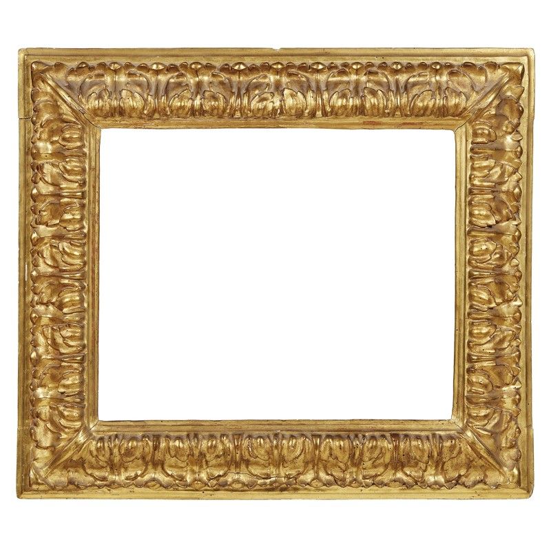 in legno intagliato e dorato, battuta sale su più ordini di fasce lisce e rovesce su larga fascia intagliata a foglie di cavolo sovrapposte, ricadenti all’esterno in gola rovescia che si porta a muro; ingombro cm 63,5x72,5, luce cm 41x49,5
