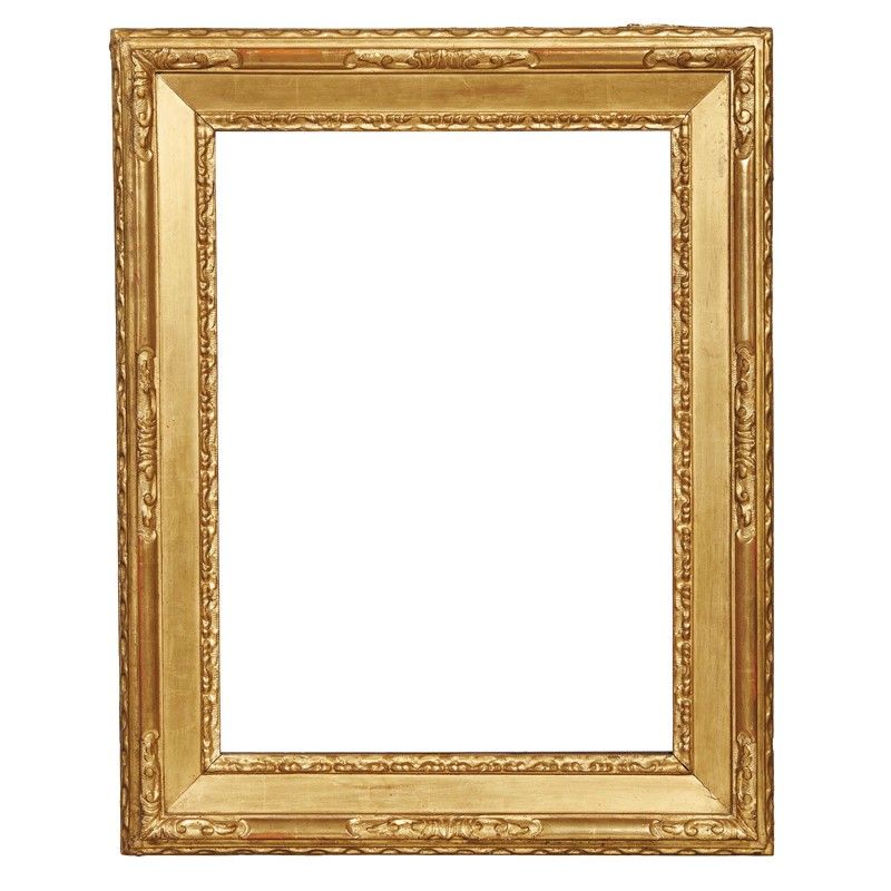 in legno dorato, con battuta a fogliette di cavolo e fascia liscia che risale su profilo aggettante decorato agli angoli e ai centri da motivi fogliacei, si porta a muro su più ordini di modanature digradanti; ingombro cm 98,5x79,5, luce cm 74x54,6