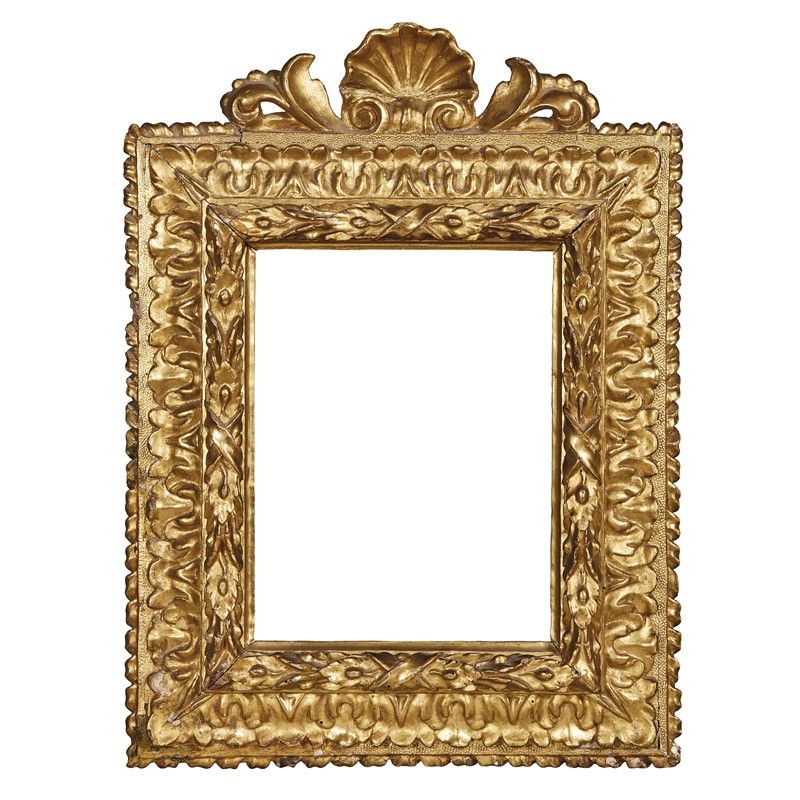 CORNICE, EMILIA, SECOLO XVII in legno intagliato e dorato, battuta liscia sale su profilo aggettante a foglie raccolte ai centri da nastrini, scende su fascia a foglie di cavolo aperte e si porta a muro con motivo a nastro ricorrente. La cornice è impreziosita da cimasa formata da conchiglia centrale, affiancata da motivi a volute ai lati; ingombro cm 55x42, luce cm29,3x22