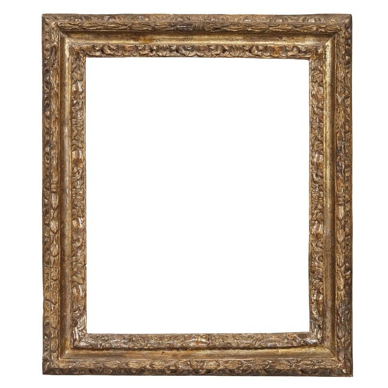 in legno intagliato e dorato, battuta a mezzefoglie si porta su gola che sale in profilatura con foglie lanceolate e nastrini, si porta a muro con baccellatura; ingombro cm 56,5x48,5, luce cm 42,8x34,7