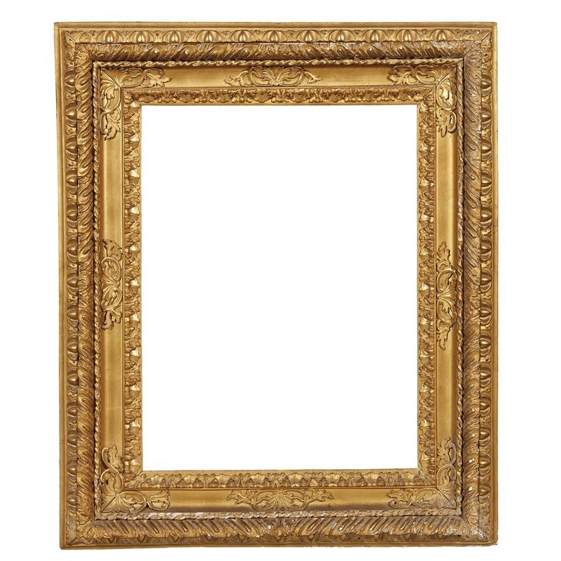 in legno intagliato e dorato, battuta a mezzefoglie scende su gola liscia con girali ai centri e agli angoli, sale su profilo a nastro ritorto e su profilo estroflesso fogliaceo, scende su gola rovescia, e si porta a muro con baccellatura; ingombro cm 88x73,5, luce cm 60,7x46
