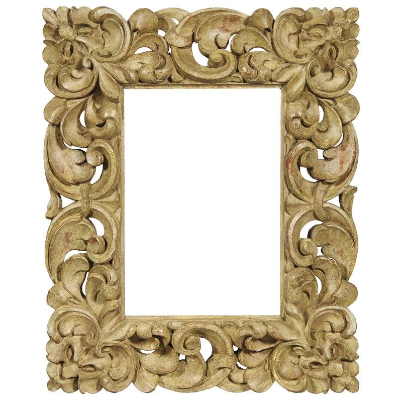 in legno intagliato e laccato, battuta a gola interamente contornata da ricco intaglio a giorno a ramages trattenuti da nastri e con mascheroni agli angoli; ingombro cm 56,5x46, luce cm 32,7x22,5