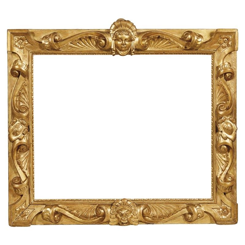 in legno intagliato e dorato, di tipo Sansovino, con battuta che si porta su fascia riccamente intagliata con mascherone a volto femminile e stemmi entro cartouches ai centri, ed impreziosita da volute ritorte terminanti in fiore aperto sugli angoli; ingombro cm 79x103,5, luce cm 65,3x80,3