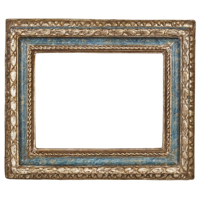 CORNICE, ITALIA CENTRALE, INIZI SECOLO XVIII in legno intagliato, dorato e laccato azzurro, battuta dorata sale profilo a torchon, per poi scendere in gola laccata color azzurro a imitare il marmo e risale su fascia a foglie ricorrenti lanceolate; ingombro cm 45x37,5, luce cm 30x22