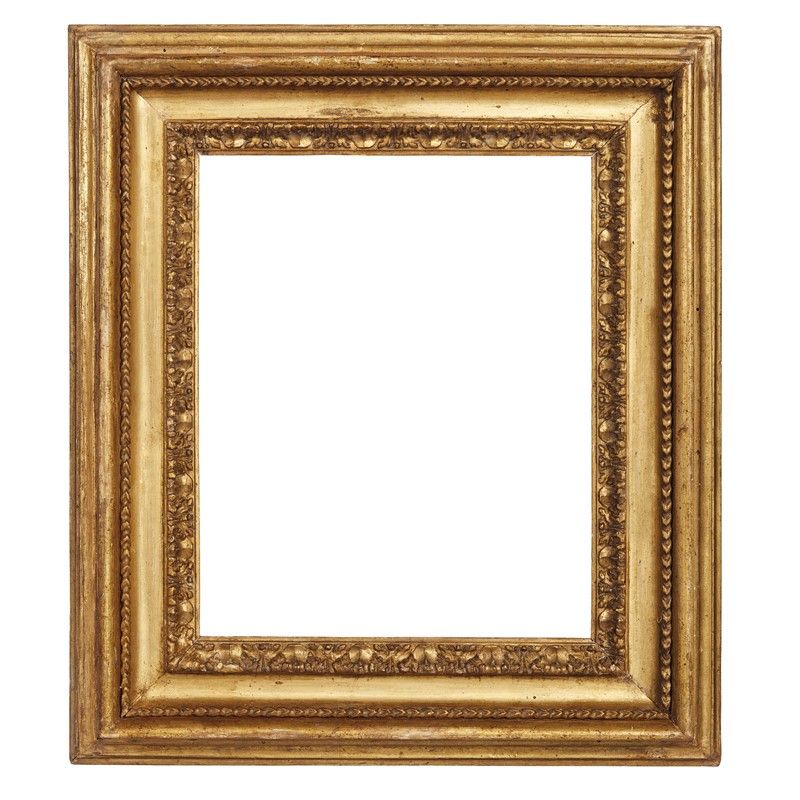 CORNICE, ITALIA CENTRALE, SECOLO XVII in legno intagliato e dorato, battuta liscia si apre su profilo a mezzefoglie e prosegue su gola e sottile profilatura a fogliette lanceolate ricorrenti, si porta a muro tramite gola estroflessa; ingombro cm 48,5x43; luce cm 31x25 cm