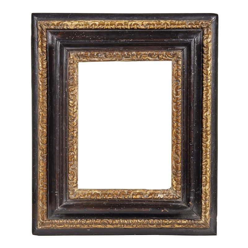 in legno intagliato, ebanizzato e dorato, battuta dorata a fogliette di cavolo, si porta su gola ebanizzata, e scende a muro con ulteriore fascia dorata analogamente lavorata; ingombro cm 49,8x42, luce cm 28x20,3