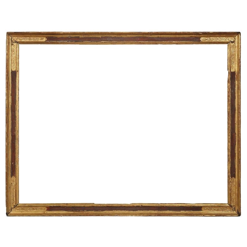 in legno dorato e dipinto di rosso, battuta dorata si porta su profilo liscio rosso entro riserve dorate a decori fogliacei; ingombro cm 160x127, luce cm 143,3x109,5