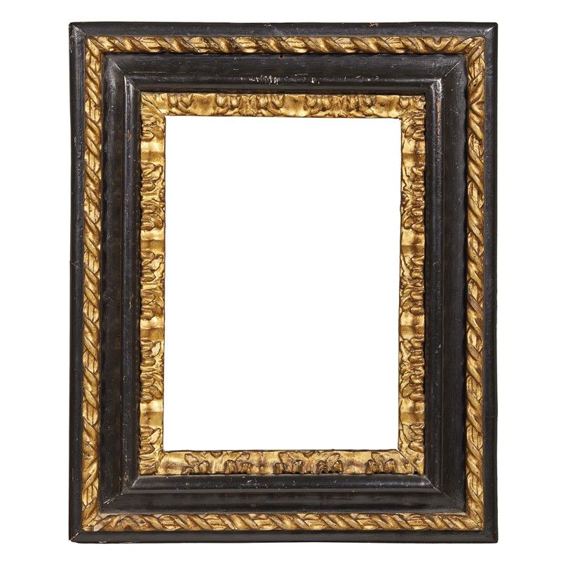 in legno intagliato, ebanizzato e dorato, battuta dorata a fogliette di cavolo si porta su gola ebanizzata entro fascia dorata a nastrino ricurvo; ingombro cm 47x39, luce cm 29,3x20,5