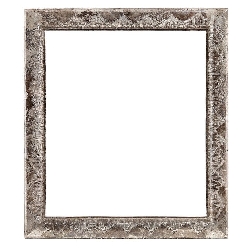 in legno intagliato e lamina metallica, fascia bombata con applicazione di lamina argentata decorata con motivi fogliacei incisi; ingombro cm 69,3x61,2, luce cm 56x48,5. Montata a specchio