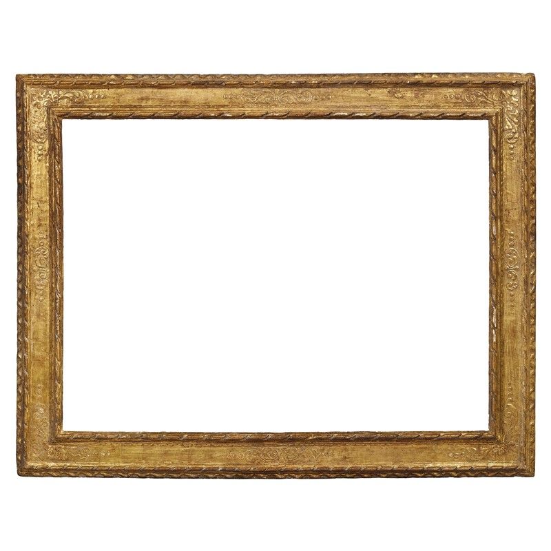 in legno intagliato e dorato, battuta sale su profilo a nastro ritorto e cassetta con motivi a girali punzonati; ingombro cm 163x125, luce cm 132x96,5