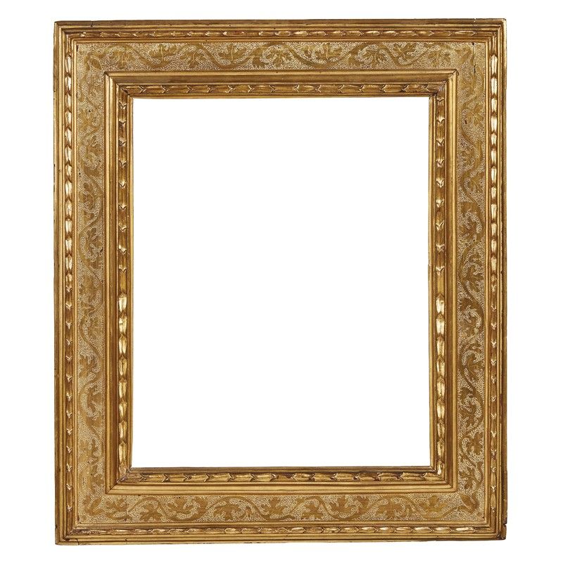in legno intagliato e dorato, battuta a foglie lanceolate scende su cassetta lavorata a bulino con tralci vegetali, e risale poi su profilatura a foglie lanceolate ricorrenti e in più ordini di modanature scende a muro; ingombro cm 86x74,5, luce cm 60,5x48,5