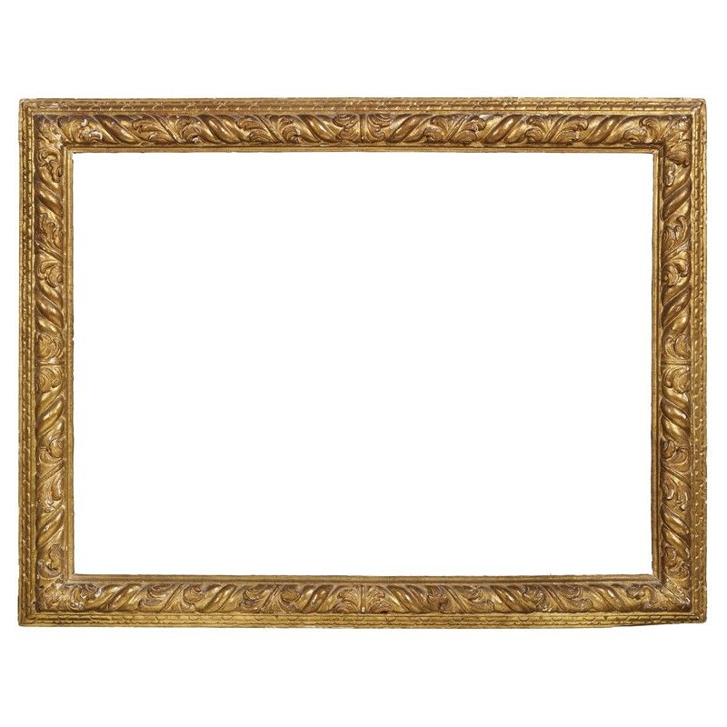in legno intagliato e dorato, battuta si pprta su fascia a grandi foglie ritorte, che scende a muro con profilo a fogliette di cavolo; ingombro cm 100x132, luce cm 80,7x109,5