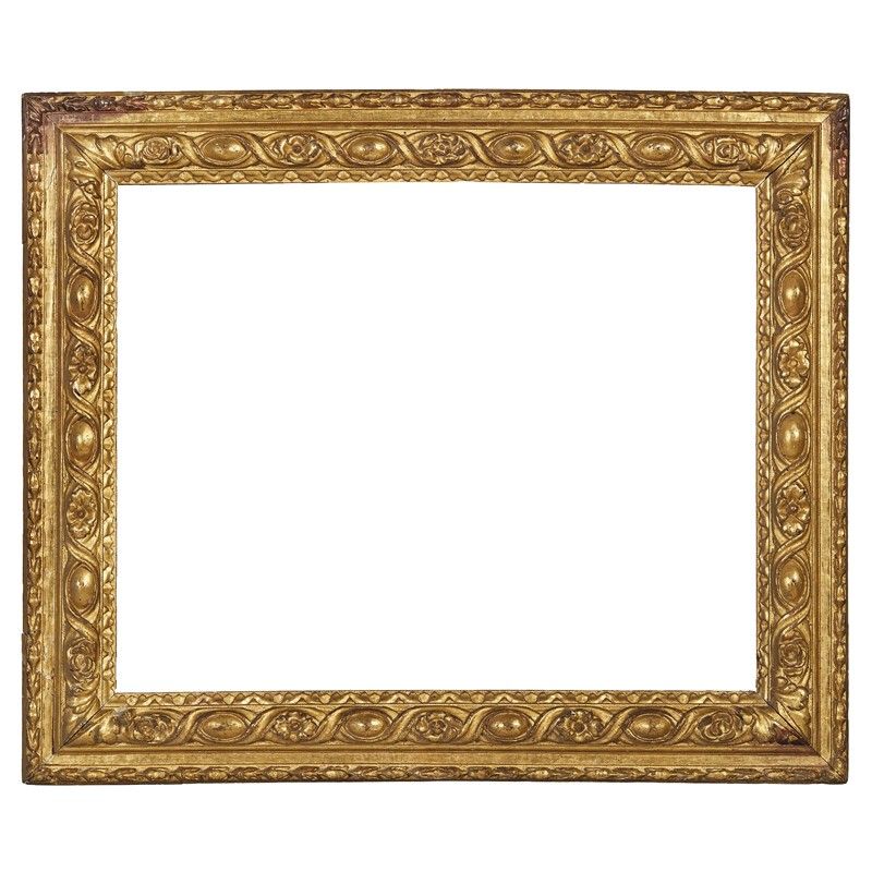 CORNICE, ITALIA SETTENTRIONALE, SECOLO XVII in legno intagliato e dorato, battuta a mezzefoglie si apre su fascia a motivo a doppio nastro intervallato da sfere e fiori aperti, scende su fascia liscia e profilo a fogliette; ingombro cm 74x89, luce cm 54,3x68,5