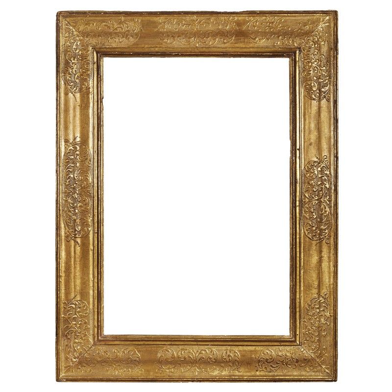 in legno dorato, battuta liscia sale su gola estroflessa e si porta su ampia fascia decorata agli angoli e ai centri da racemi e motivi vegetali stilizzati; ingombro cm 163x122,5, luce cm 120,5x80,5