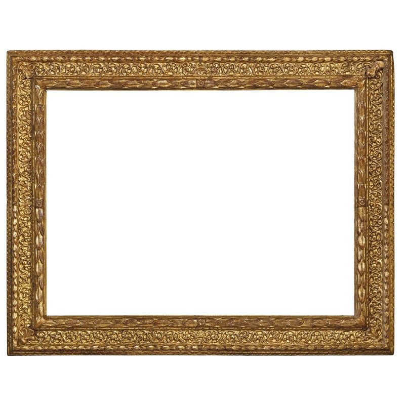 in legno intagliato e dorato, battuta a fogliette lanceolate si porta su cassetta lavorata a girali entro fascia a fogliette lanceolate; ingombro cm 130x165, luce cm 96x131