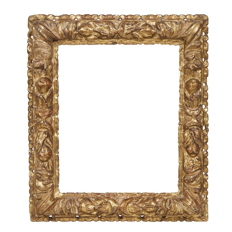 CORNICE, ITALIA SETTENTRIONALE, SECOLO XVIII in legno intagliato e dorato, battuta a perline e fusarole si apre su ricco intaglio a foglie e frutti fermato ai centri da nastri, e termina a muro con orlatura lavorata a giorno; ingombro cm 36x31, luce cm 25,8x20,5