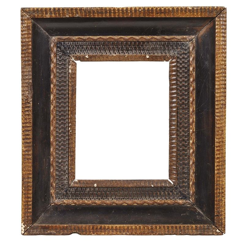in legno intagliato, ebanizzato e dorato, battuta dentellata dorata si apre su cassetta a guilloché entro profilo dorato con motivo a treccia che si porta su gola liscia contornata da profilo dorato; ingombro cm 47x41,5, luce cm 24,5x19,5