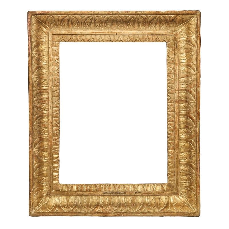 in legno intagliato e dorato, battuta a mezzefoglie risale su fascia a palmette portandosi a muro; ingombro cm 35x29, luce cm 24,4x18,3