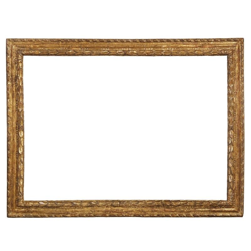 CORNICE, PIEMONTE, INIZI SECOLO XVIII in legno intagliato e dorato, battuta sale su fascia a foglie lanceolate racchiuse da nastrini, la quale si porta poi su fascia decorata a perline e fusarola e termina con motivo a nastrino ritorto; ingombro cm 104x138, luce cm 83,5x117,5