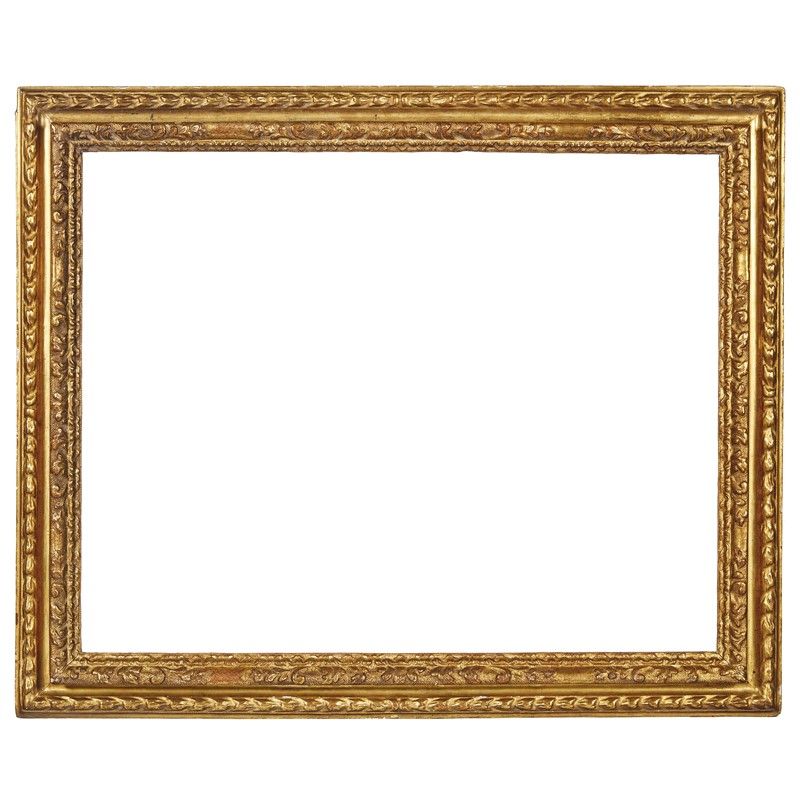 CORNICE, PIEMONTE, INIZI SECOLO XVIII in legno intagliato e dorato, battuta a fogliette si porta su fascia lavorata a motivi fogliacei intervallati da cartelle, entro fascia con decoro a foglie lanceolate ricorrenti fermate da nastrini ai centri; ingombro cm 108,5x89, luce cm 89,5x70