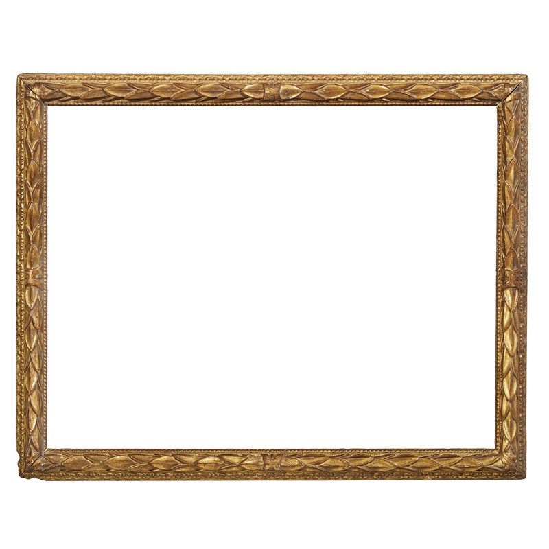 in legno intagliato e dorato, battuta perlinata si apre su fascia riccamente ornata a foglie lanceolate racchiuse sui centri da nastrini e si porta a muro con fascia a mezzefoglie; ingombro cm 86x109, luce cm 73x95