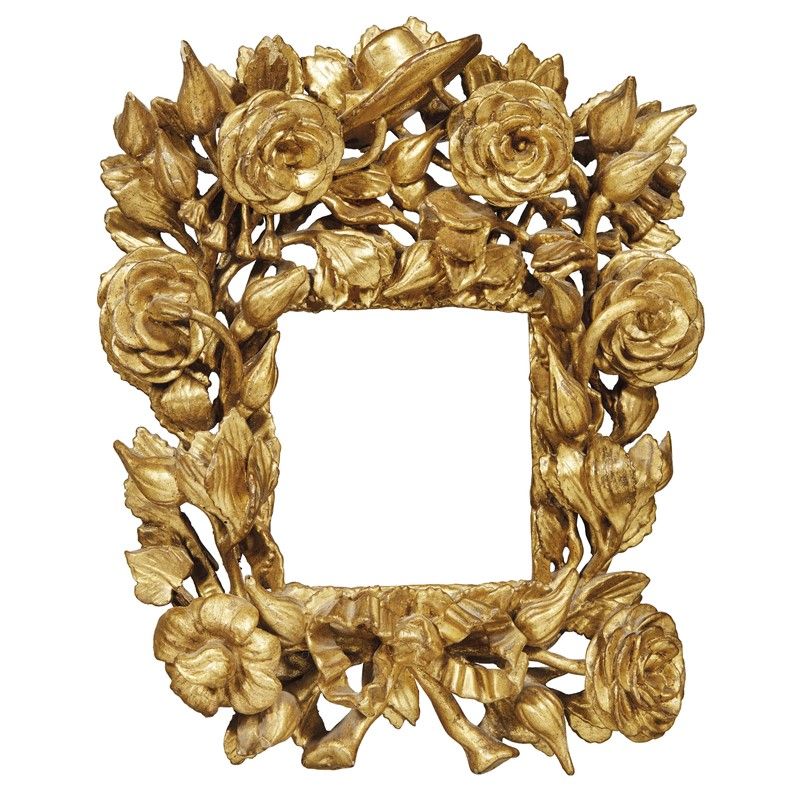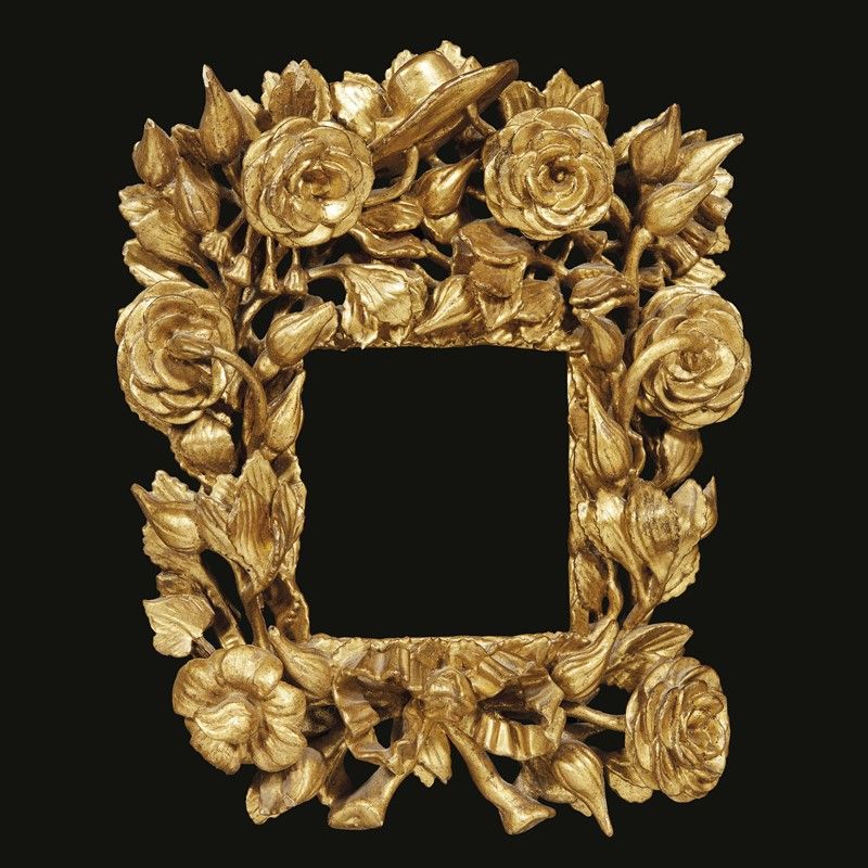 in legno intagliato e dorato, battuta interamente contornata da ricco intaglio a giorno a tutto tondo che dal centro inferiore raffigurante fiocco si sviluppa in rose, racemi e boccioli fino alla cimasa composta da galero sopra due rose; ingombro cm 34,5x29, luce cm 12,6x12,2