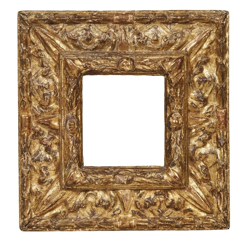 CORNICE, SPAGNA, SECOLO XVII in legno intagliato e dorato, battuta si porta su fascia profilata con fogliette alternate a bocciuoli sui centri cade su fascia impreziosita da motivi vegetali e profilatura a foglie lanceolate e nastrini; ingombro 37x35, luce cm 15x13,7