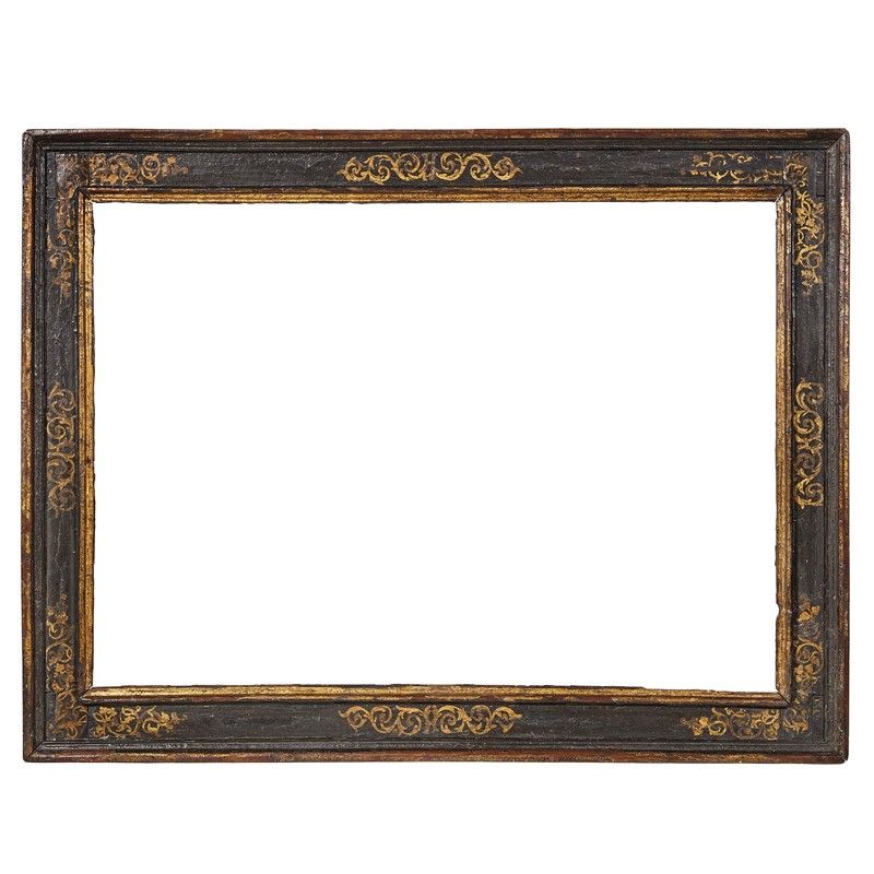 CORNICE, TOSCANA, FINE SECOLO XVI in legno laccato e dorato, battuta dorata si porta su sagoma liscia a cassetta con decori a racemi sugli angoli e ai centri, risale su sottile fascia dorata e digradante, portandosi a muro; ingombro cm 95x73, luce cm 78x56