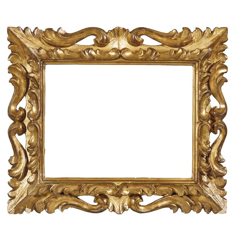 CORNICE, TOSCANA, SECOLO XVII in legno intagliato e dorato, battuta a gola liscia si porta su fascia profilata intagliata ad elementi vegetali che scende a muro con un intaglio a giorno a volute e foglie aperte sugli angoli; ingombro cm 41,5x50, luce cm 29,5x38,5