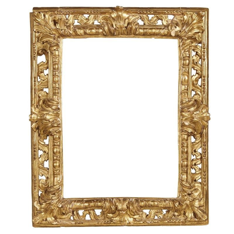 CORNICE, TOSCANA, SECOLO XVII in legno intagliato e dorato, battuta sale su fascia baccellata impreziosita da foglie di acanto aperte ai centri e agli angoli che scendono su intaglio a giorno a volute fogliacee racchiuse da fascia a perline e fusarole; ingombro cm 102x82,5, luce cm 73,5x53,2. Montata a specchio