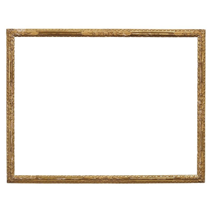 in legno intagliato e dorato, battuta baccellata sale su fascia a cartelle intervallate da profilature bulinate con decori floreali, che scende in fascia a motivi vegetali; ingombro cm 160,5x123,5, luce cm 147x110,5
