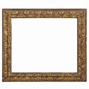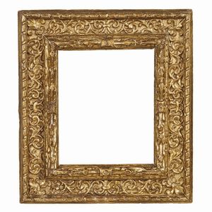 CORNICE, ITALIA SETTENTRIONALE, INIZI SECOLO XVII in legno intagliato e dorato, battuta sale su profilo a nastro [..]