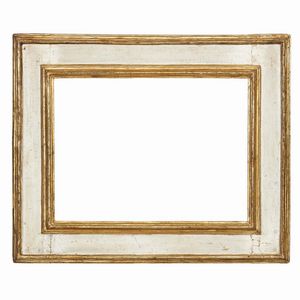 CORNICE, ITALIA CENTRALE, SECOLO XVII in legno laccato e parzialmente dorato, battuta dorata sale con modanature [..]