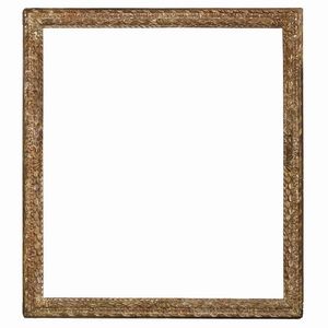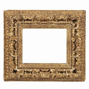 COPPIA DI CORNICI, EMILIA, SECOLO XVII in legno intagliato e dorato, battuta a unghiature sale su fascia traforata [..]