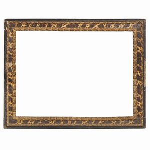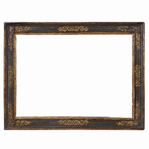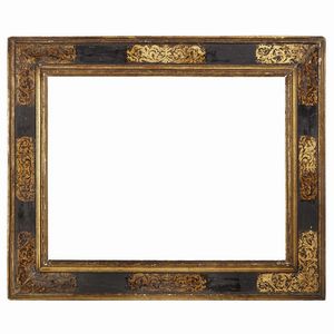 CORNICE, ITALIA CENTRALE, SECOLO XVII in legno dorato ebanizzato e dipinto, battuta a fogliette sovrapposte scende [..]