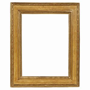 PICCOLA CORNICE, ITALIA SETTENTRIONALE, SECOLO XIX in legno intagliato, battuta si porta entro fascia lastronata [..]