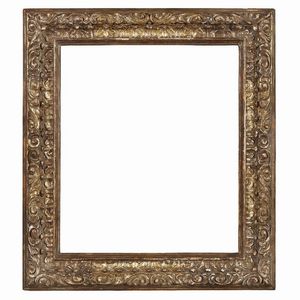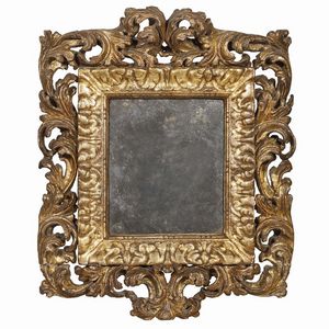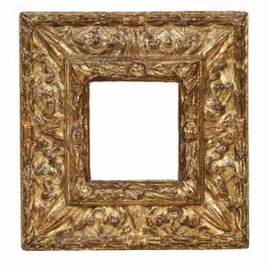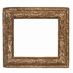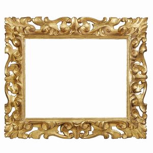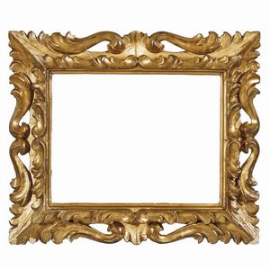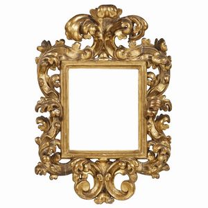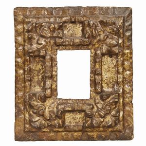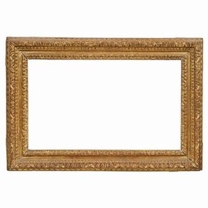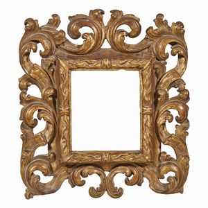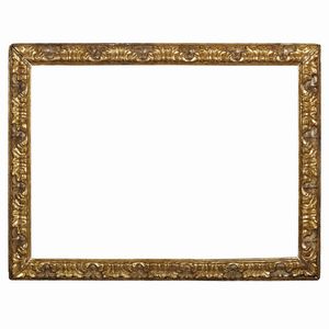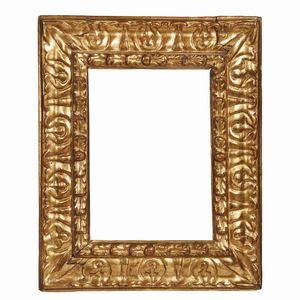 PICCOLA CORNICE, TOSCANA, SECOLO XVII in legno intagliato e dorato, battuta sale su decoro a doppie volute che [..]
