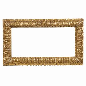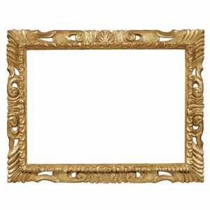CORNICE, ITALIA CENTRALE, SECOLO XVII in legno intagliato e dorato, battuta si porta su fascia a grandi foglie [..]