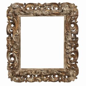 CORNICE, ITALIA CENTRALE, SECOLO XVII in legno intagliato argentato e dipinto, battuta si porta su ampio profilo [..]