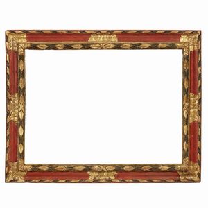 CORNICE, ITALIA SETTENTRIONALE, SECOLO XVII in legno intagliato, dorato e dipinto, battuta sale su fascia rilevata [..]