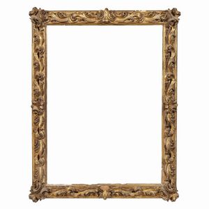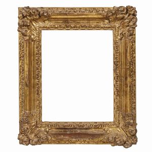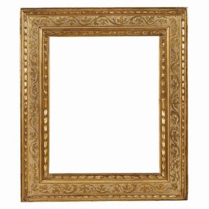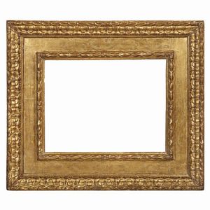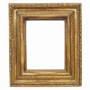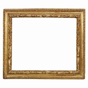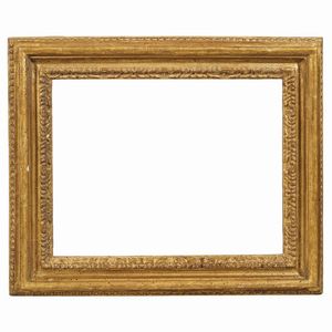 CORNICE, ITALIA CENTRALE, SECOLO XVII in legno intagliato e dorato, battuta liscia si apre su profilo a mezzefoglie [..]