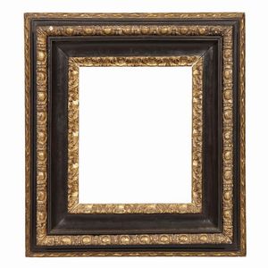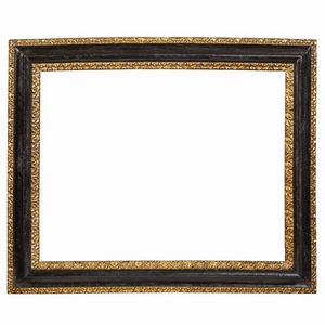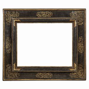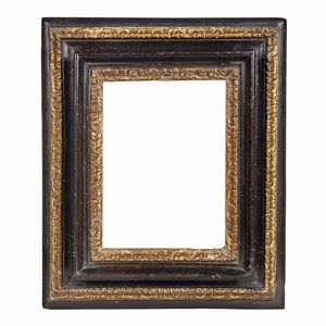 CORNICE, TOSCANA, SECOLO XVII in legno intagliato, ebanizzato e dorato, battuta dorata sale su profilo estroflesso [..]