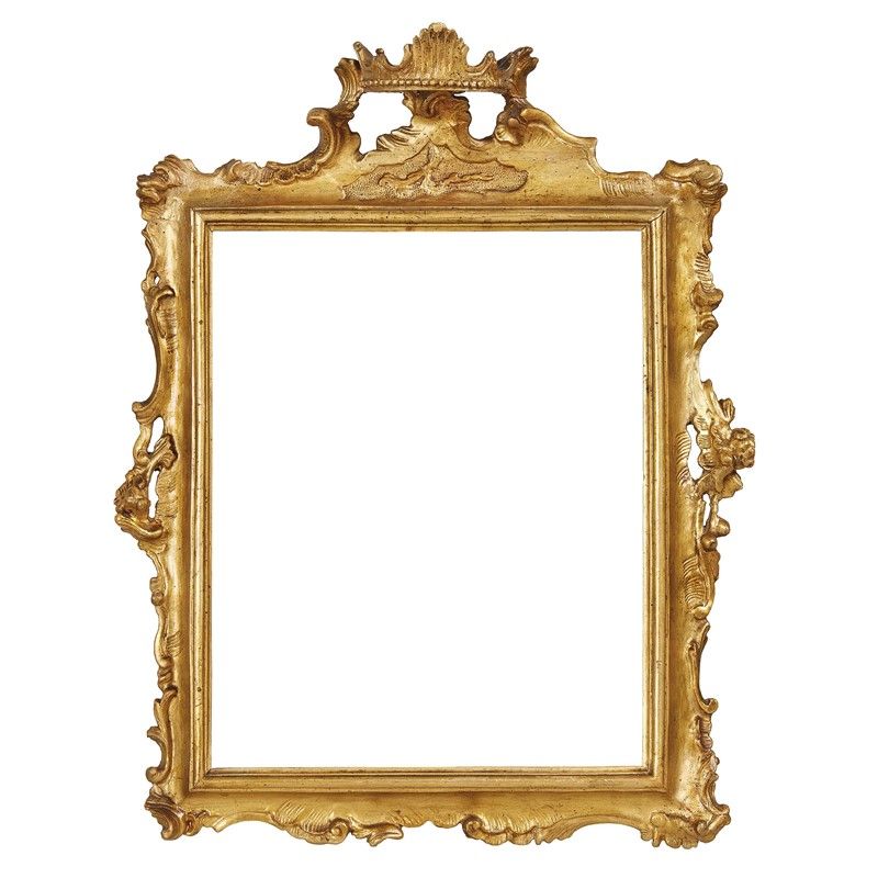 in legno intagliato e dorato, sottile battuta si porta su ricco intaglio rocaille a giorno, che dalla cimasa con corona aggettante scende sui fianchi con intagli a fiorellini; ingombro cm 54,5x43, luce cm 35,5x28,8