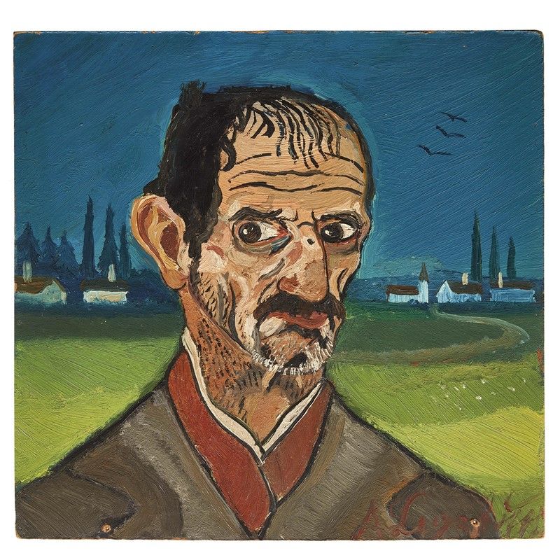 L’opera qui presentata, viene così descritta nel catalogo generale: “Un segno inquieto costruisce il volto marcando le rughe sulla fronte, le guance incavate e le sopracciglia aggrottate sullo sguardo teso, mentre pennellate larghe e libere di espressionistico vigore rendono mirabilmente la muscolatura contratta. Sullo sfondo, ampie e sintetiche campiture di diversa qualità di verde definiscono lo sviluppo in profondità dello spazio, mentre il cielo tinge dei colori della sera le case in lontananza, confondendosi con il profilo degli alberi e delle colline. La capigliatura nera è più folta rispetto agli autoritratti della fine del terzo periodo permette di datare l’opera all’inizio degli anni Cinquanta. S.S.”
